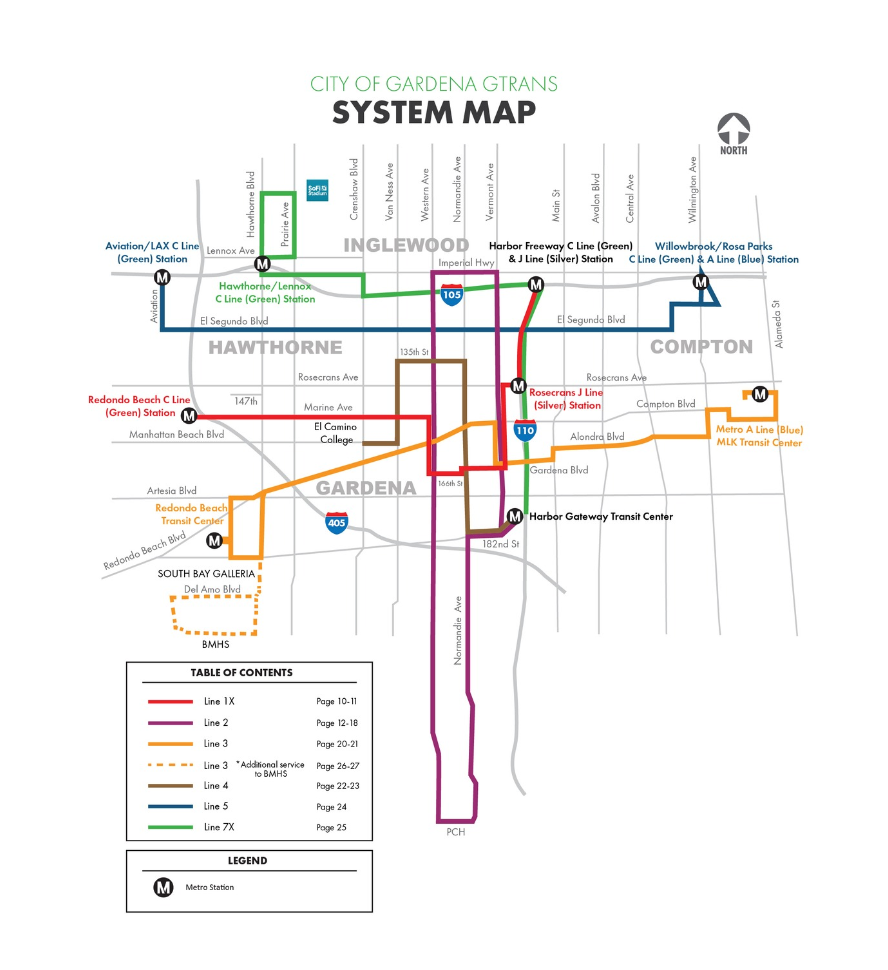 Service is deployed to the City of Gardena and throughout the adjacent communities of Torrance, Redondo Beach, Carson, Compton, City of Los Angeles, Hawthorne, Lawndale, Inglewood, and certain unincorporated areas of Los Angeles County. GTrans also serves downtown Los Angeles and interfaces at several points with Los Angeles County Metropolitan Transportation Authority’s (Metro) A (Blue) and C (Green) Line light rail services, J (Silver) Line at Harbor Gateway Transit Center, and Metro bus service. GTrans also connects with Torrance Transit, Beach Cities Transit, Lawndale Beat, the Los Angeles Department of Transportation (LADOT), and the City of Compton’s Renaissance Transit. More than two-thirds of the GTrans service area lies outside the City of Gardena boundaries. Customers may transfer between many of these services with a special interagency transfer or the regional LA County monthly EZ Transit Pass.