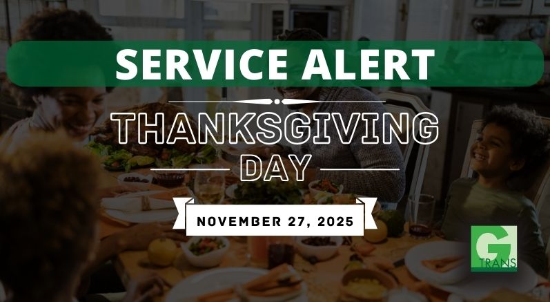 GTrans buses will operate a weekend schedule on Thanksgiving Day (November 27, 2025). If you have questions, please contact GTrans at (310) 965-8888 (Mon-Fri 8:00 a.m. – 5:00 p.m.). Please be aware that our Customer Service office will be closed on Thursday, 11/27 and Friday, 11/28.